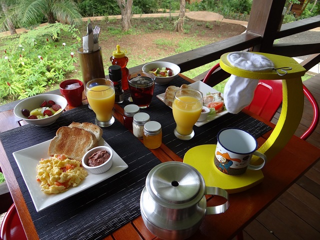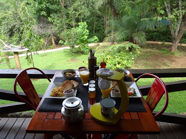 Su desayuno se servirá de 7h a 9h con vistas a la jungla de la piscina en el fondo.